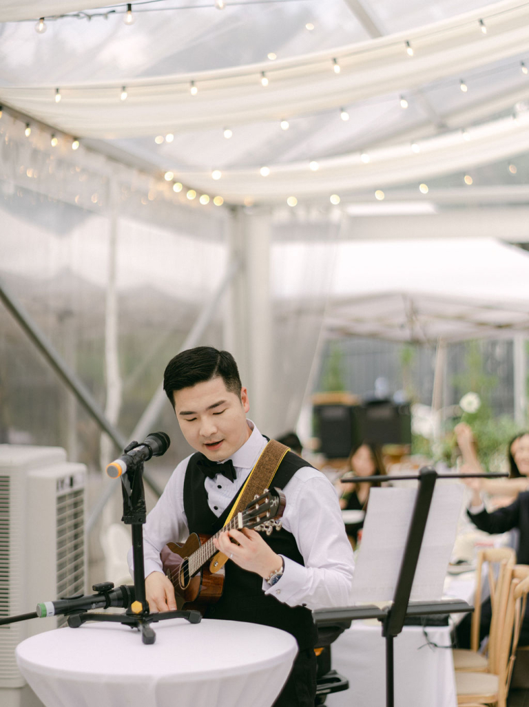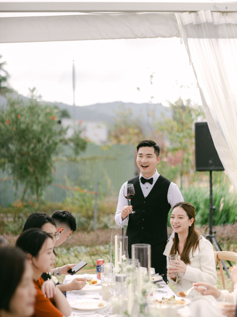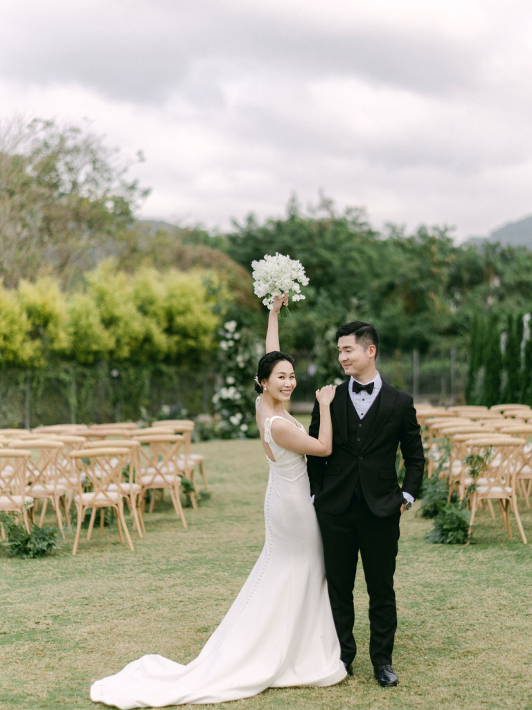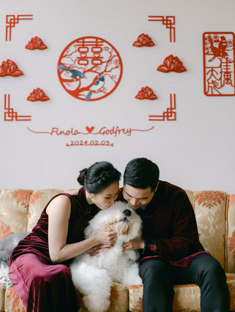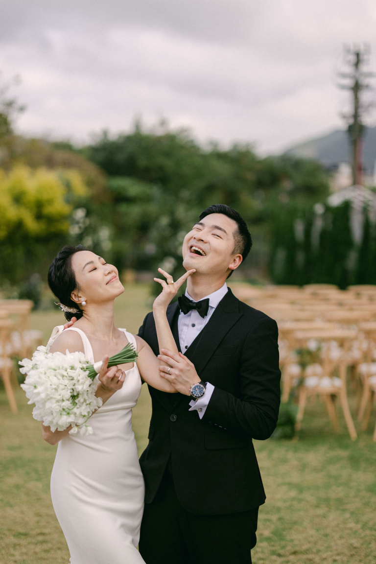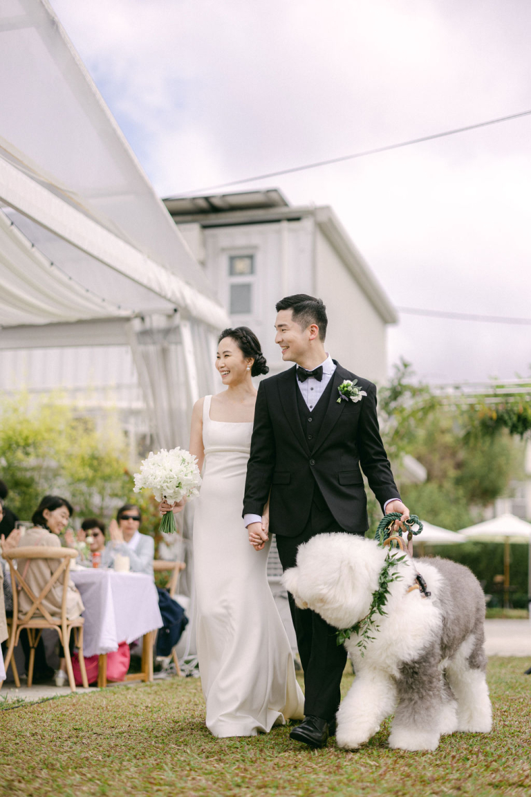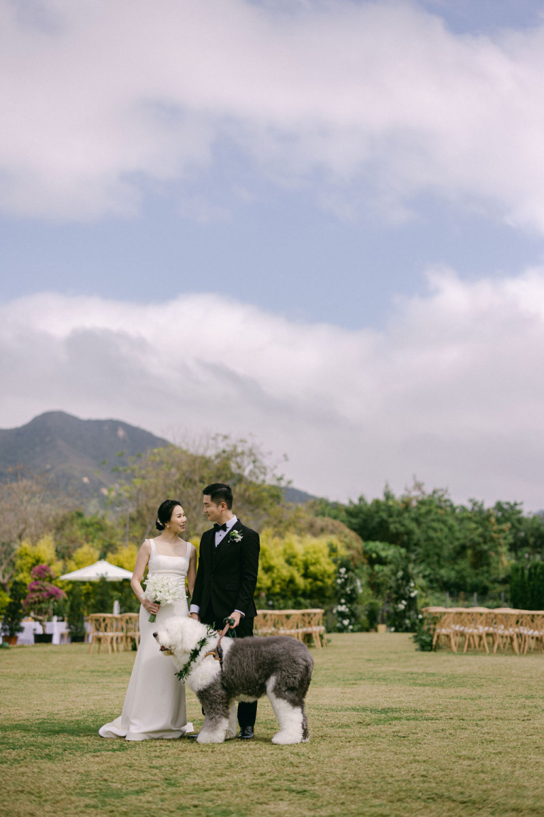 My team and I had the pleasure of photographing Finola and Godfrey's outdoor wedding on a vast grassy field. The venue was adorned with a charming touch as their adorable dog accompanied them. The white-themed decorations created a stunning and romantic ambiance, adding to the beauty of the occasion.