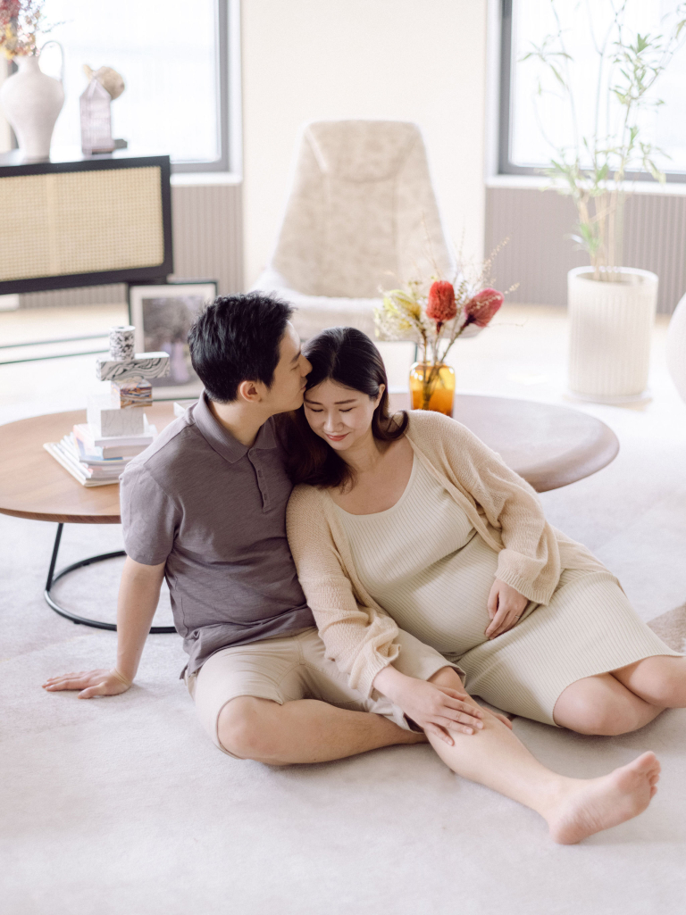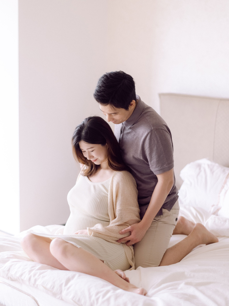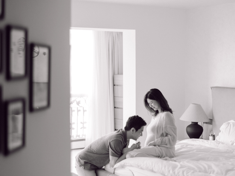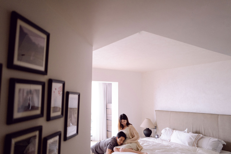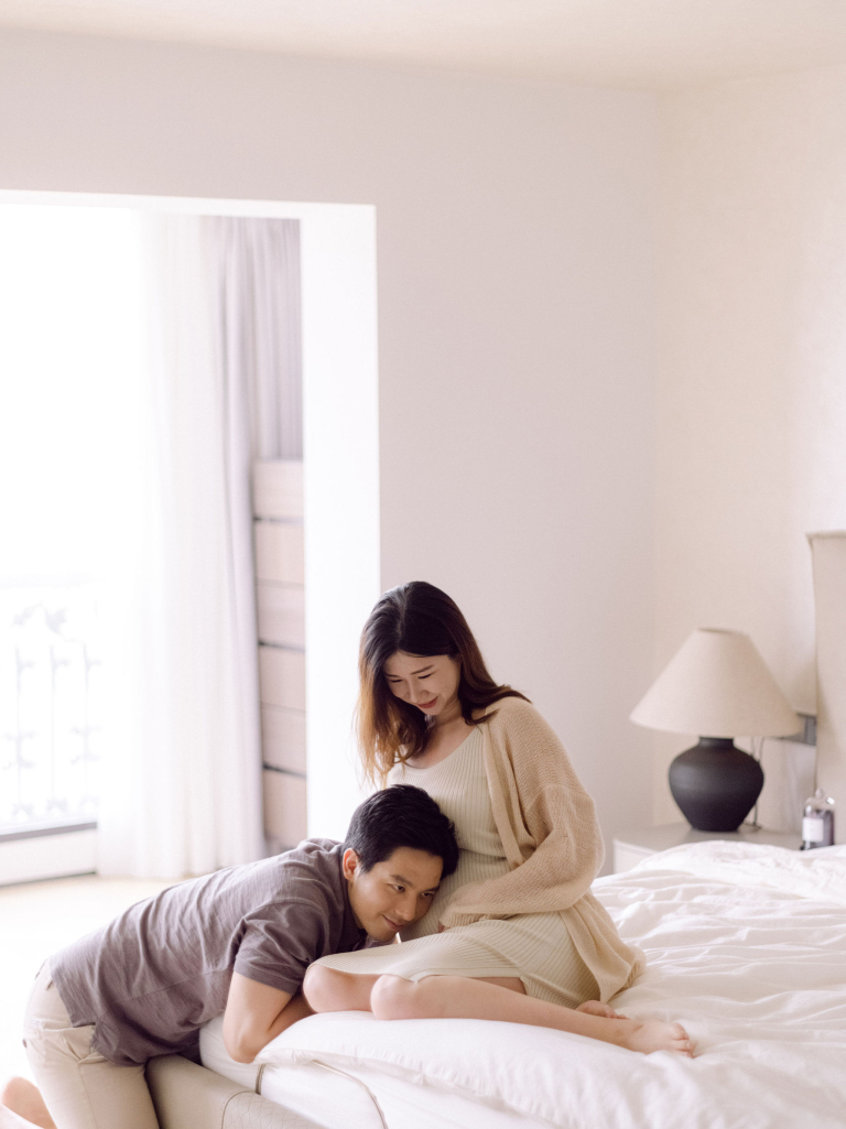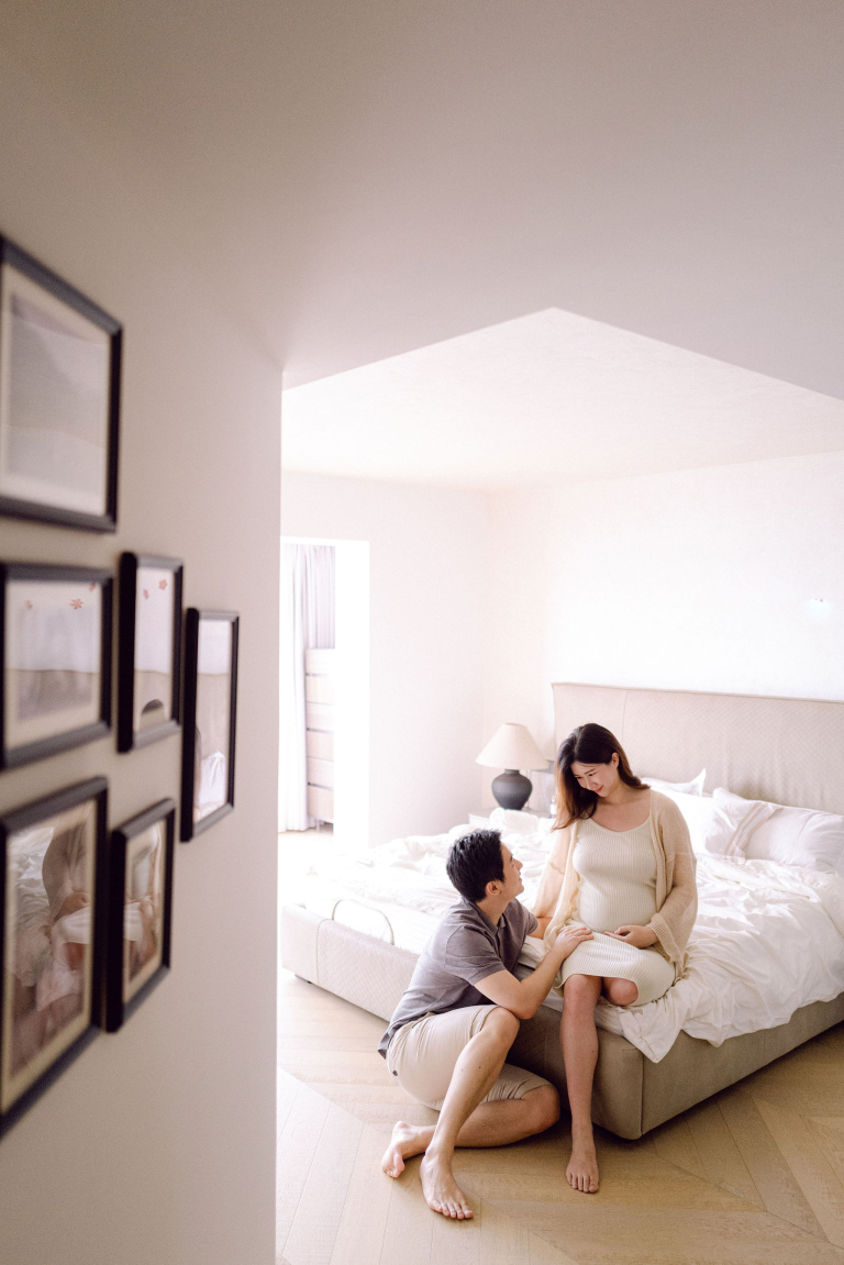In addition to the bedroom shots, we also used various parts of their home as backdrops. This added a personal touch to the photos, capturing the essence of their everyday life. The session was filled with warmth and connection, making it a memorable experience for everyone involved. The images will serve as beautiful reminders of this precious time as they prepare to welcome their new baby.