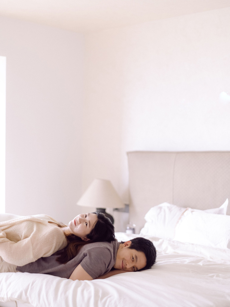 Joey and Alan were full of happiness as they played on the bed, sharing laughter and creating joyful moments. The comfortable and familiar environment allowed them to relax and be themselves, resulting in natural and heartwarming photographs. Joey's radiant smile and Alan's playful interactions made every shot special.