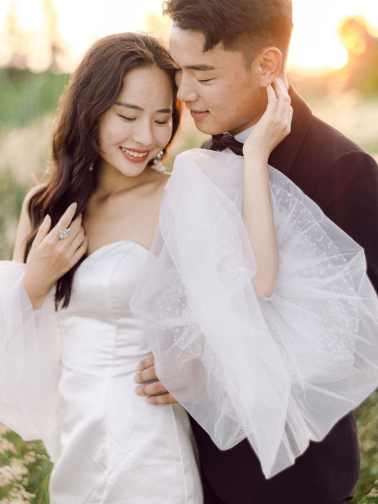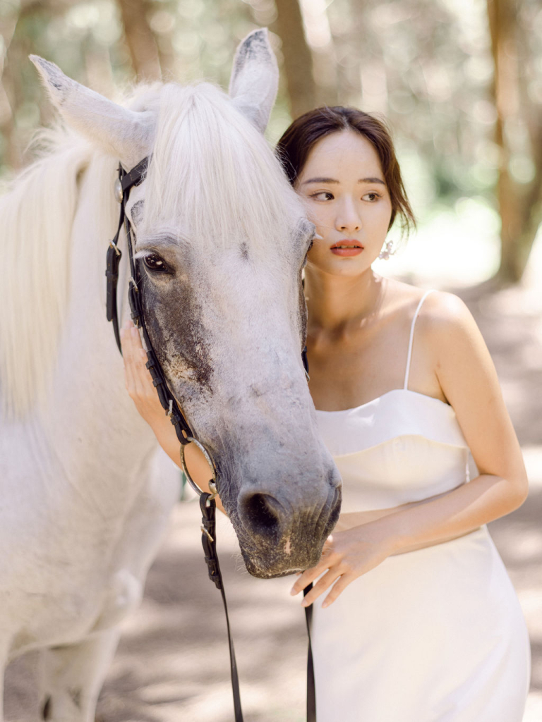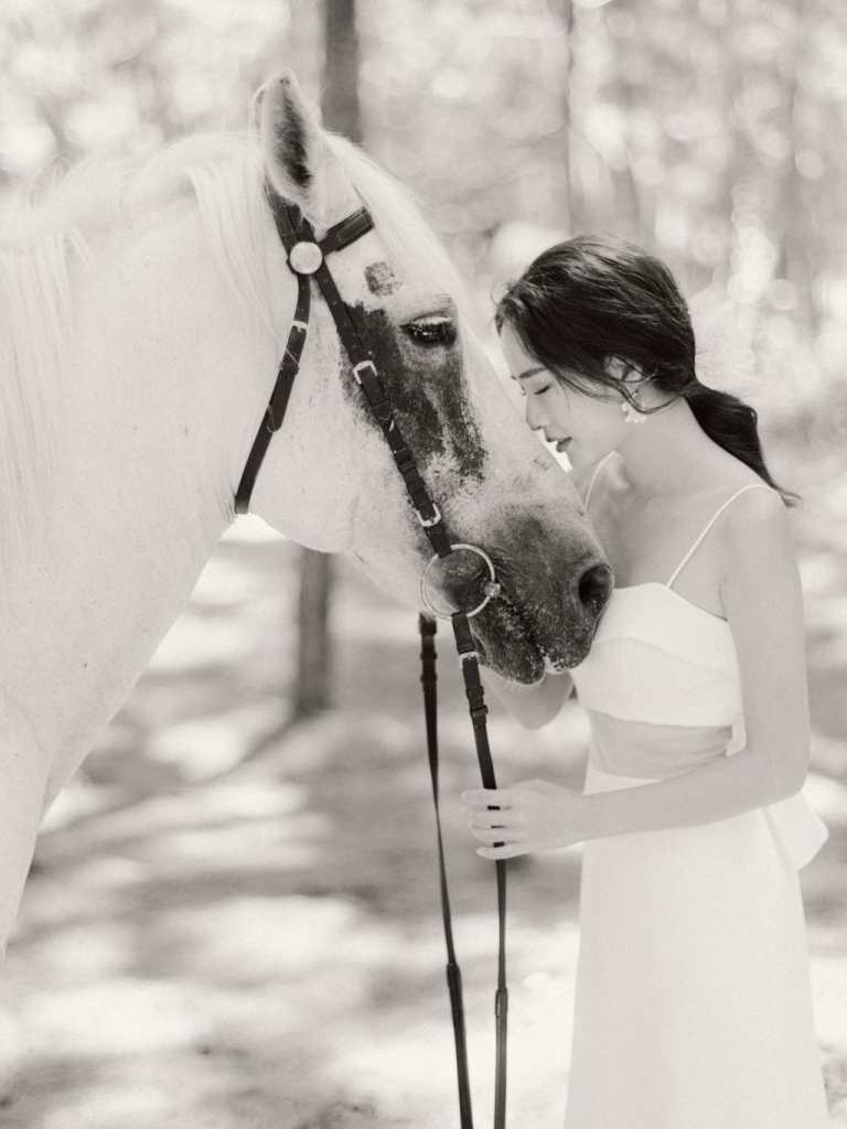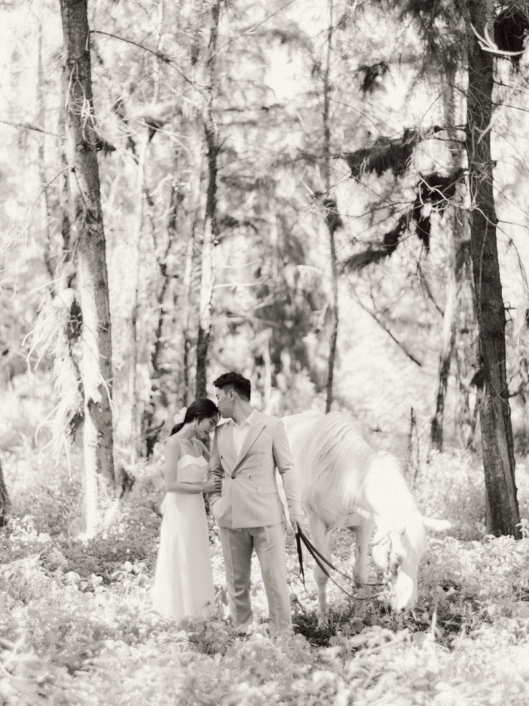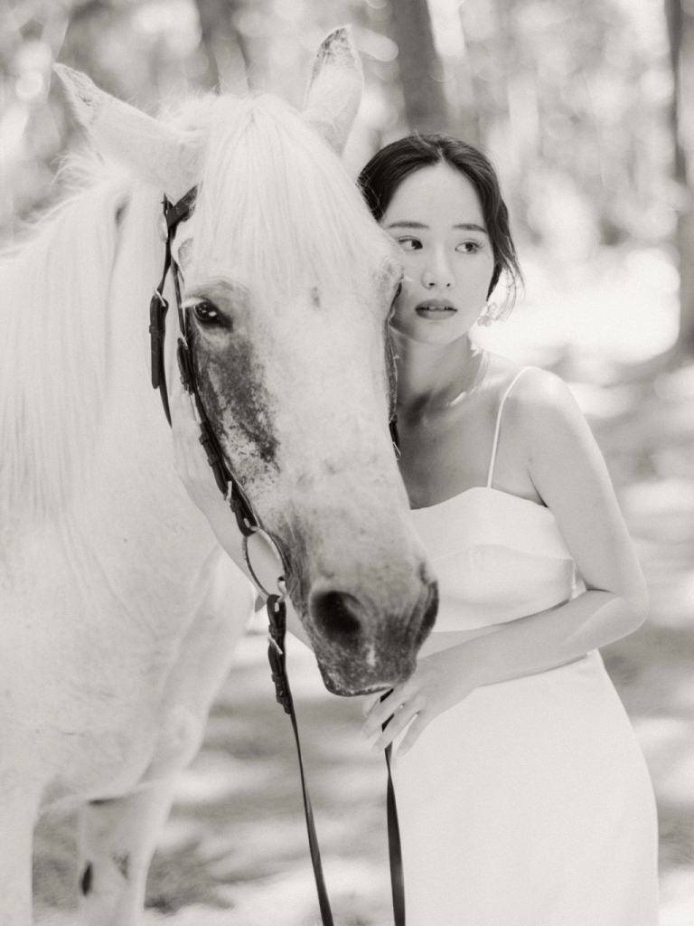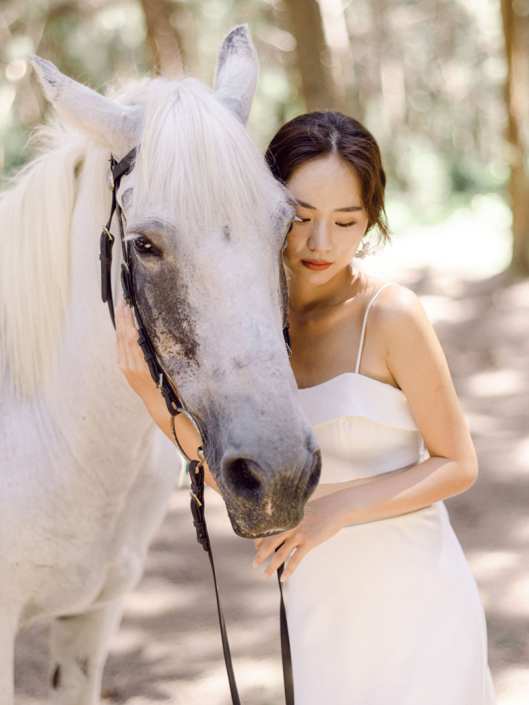 In the afternoon, Amy changed into a beautiful wedding gown and Brian into a dashing suit. Adding a touch of magic to the shoot, they brought along a white horse, making them look like a real-life prince and princess. The sight of them with the horse was enchanting, and we found an idyllic spot in the meadow where they could walk hand in hand. Their sweet interactions—holding hands, laughing, and sharing kisses—created an atmosphere of romance and tenderness that was truly heartwarming.