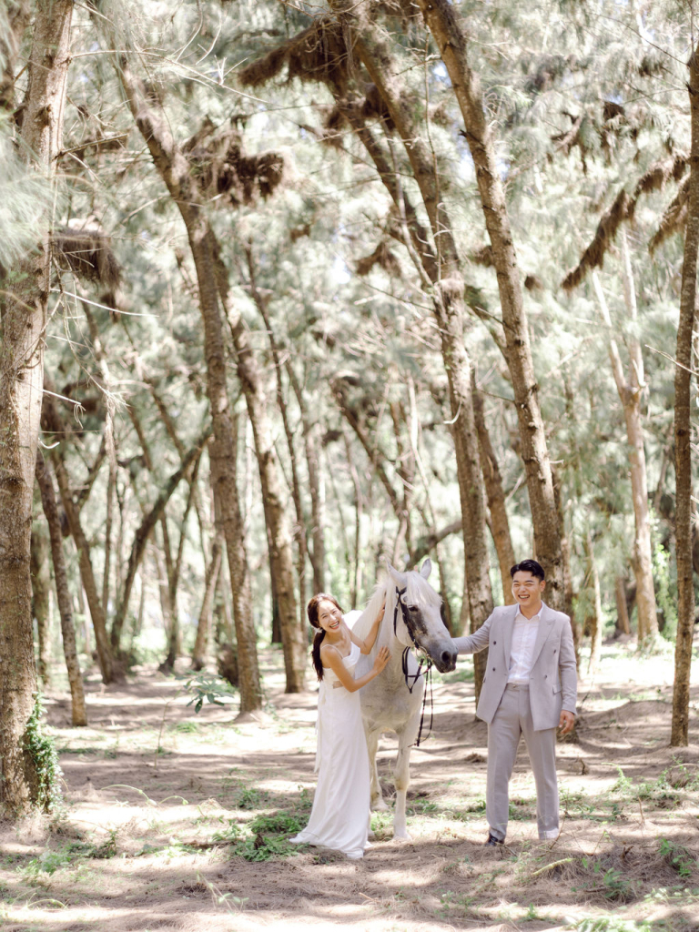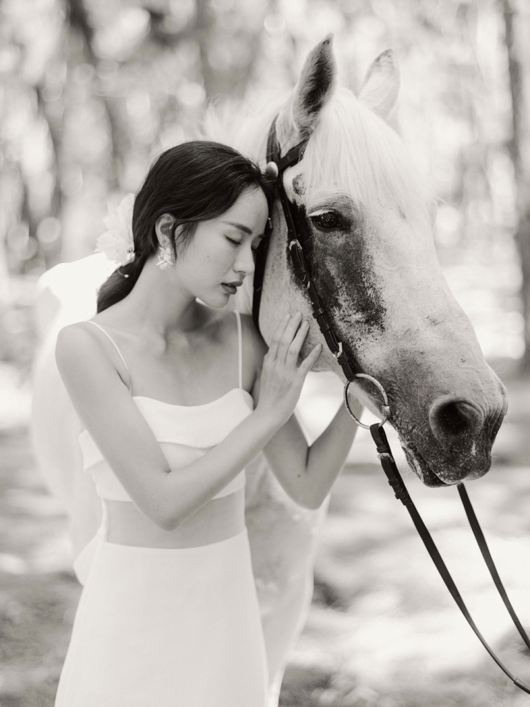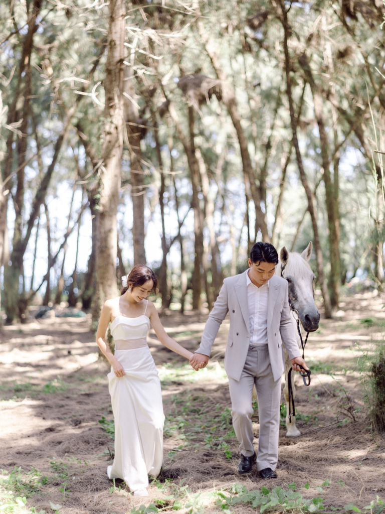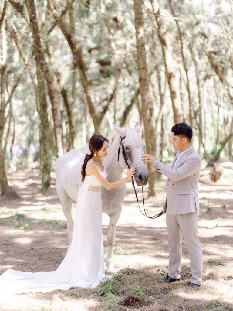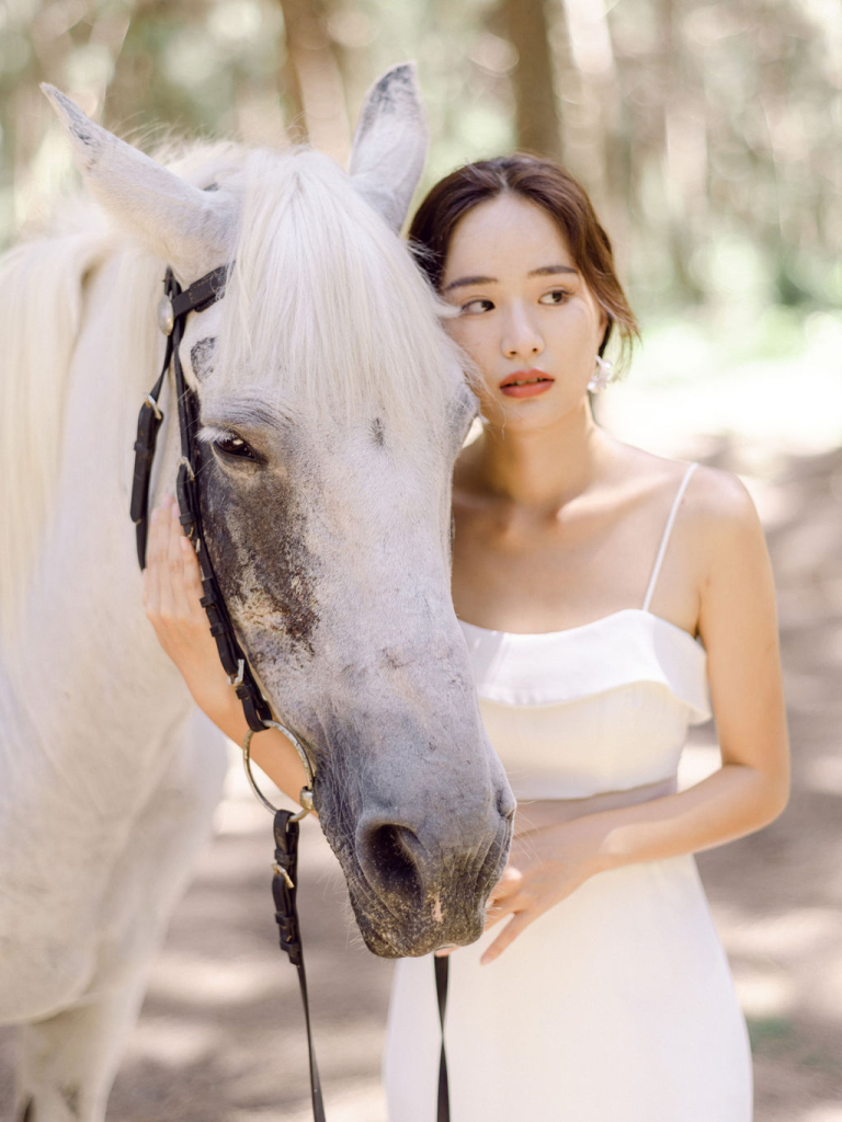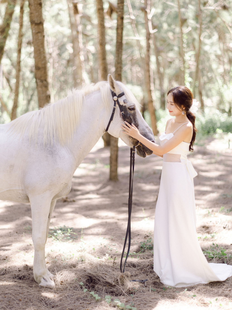 In the afternoon, Amy changed into a beautiful wedding gown and Brian into a dashing suit. Adding a touch of magic to the shoot, they brought along a white horse, making them look like a real-life prince and princess. The sight of them with the horse was enchanting, and we found an idyllic spot in the meadow where they could walk hand in hand. Their sweet interactions—holding hands, laughing, and sharing kisses—created an atmosphere of romance and tenderness that was truly heartwarming.