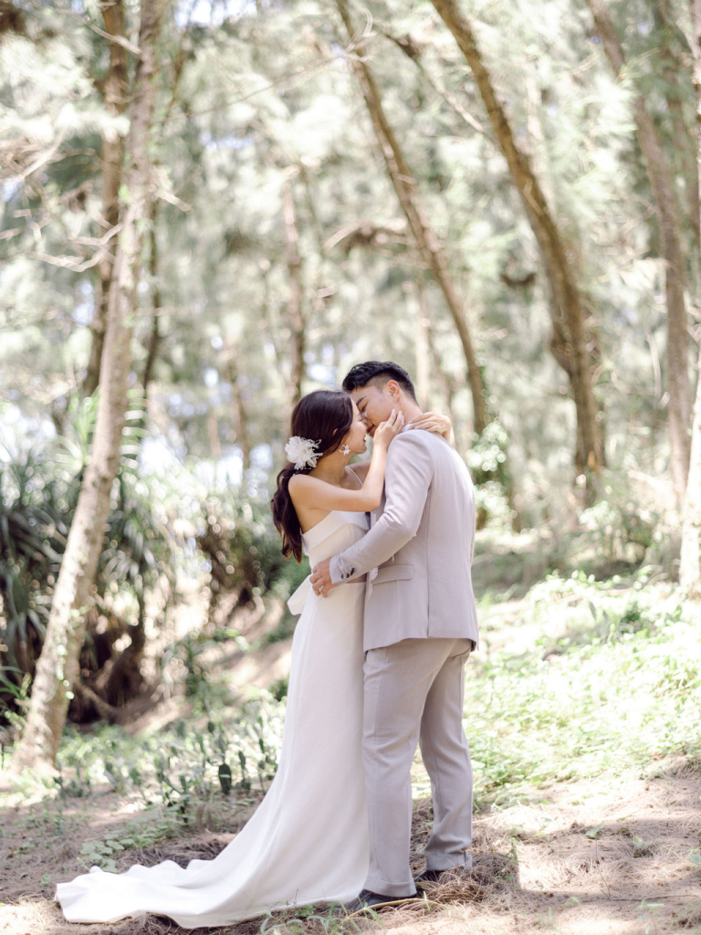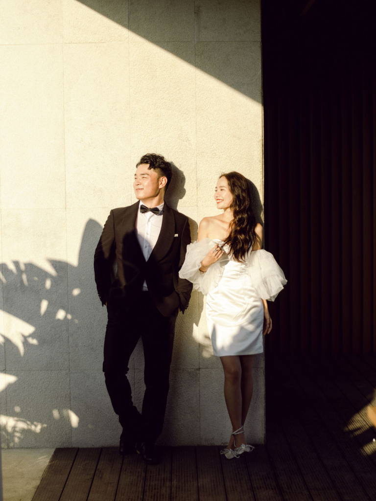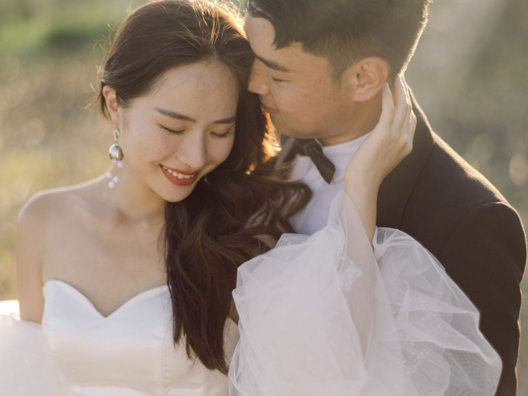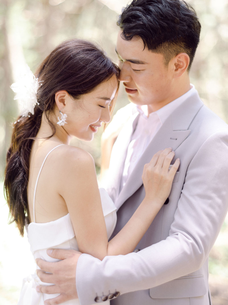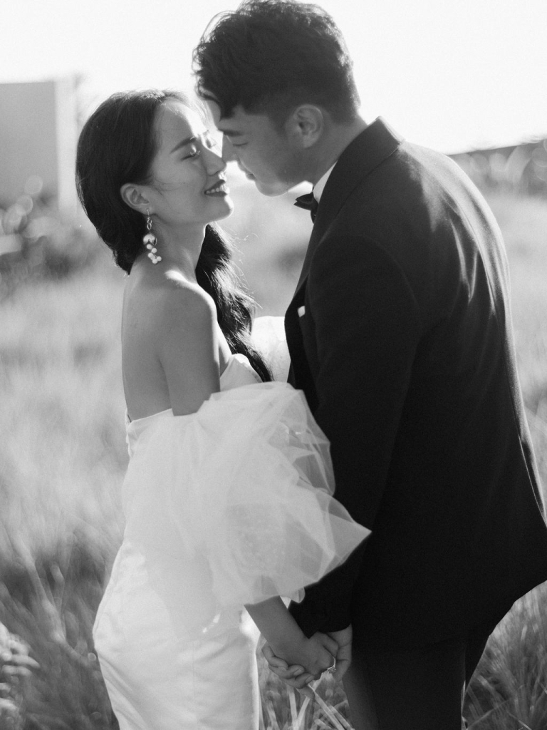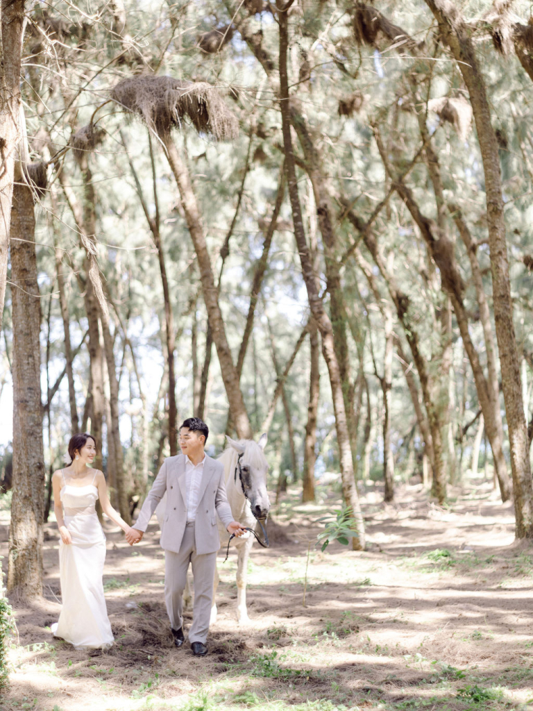 In the afternoon, Amy changed into a beautiful wedding gown and Brian into a dashing suit. Adding a touch of magic to the shoot, they brought along a white horse, making them look like a real-life prince and princess. The sight of them with the horse was enchanting, and we found an idyllic spot in the meadow where they could walk hand in hand. Their sweet interactions—holding hands, laughing, and sharing kisses—created an atmosphere of romance and tenderness that was truly heartwarming.