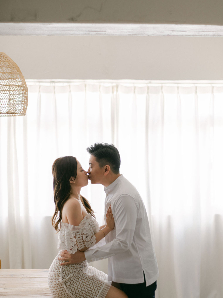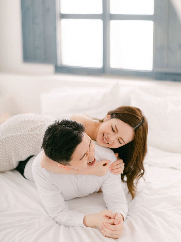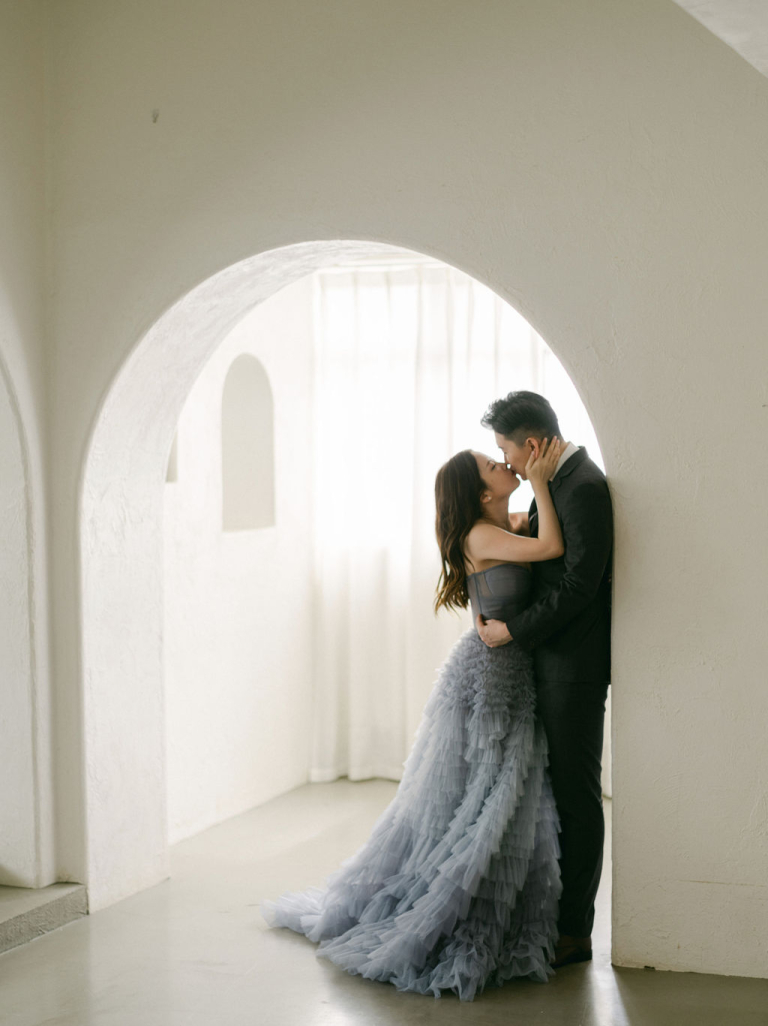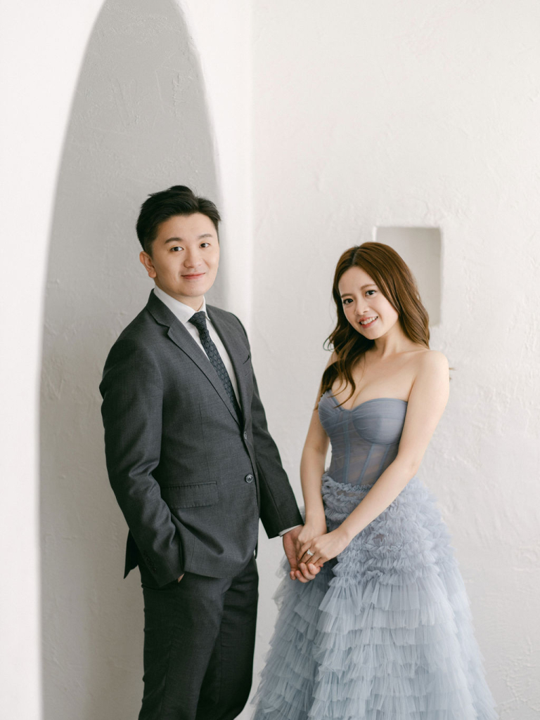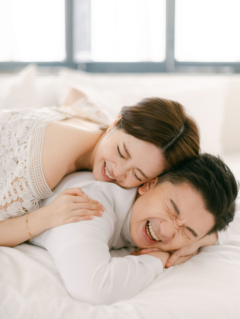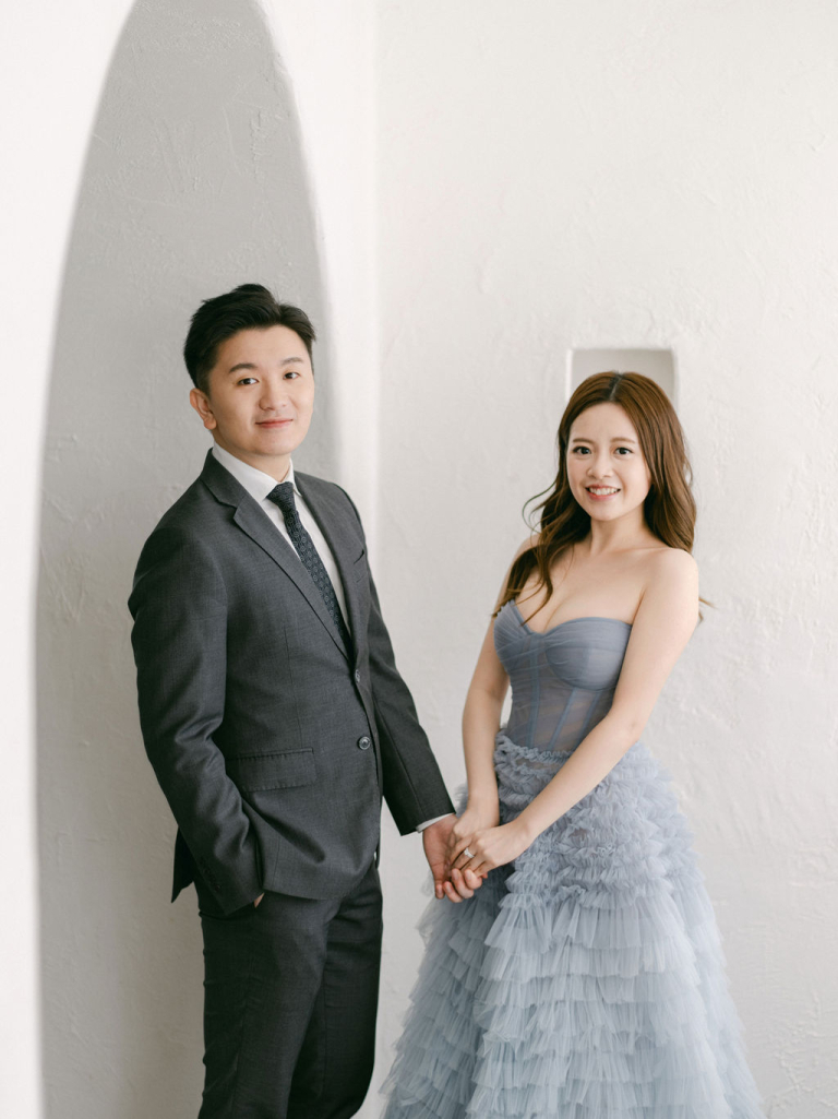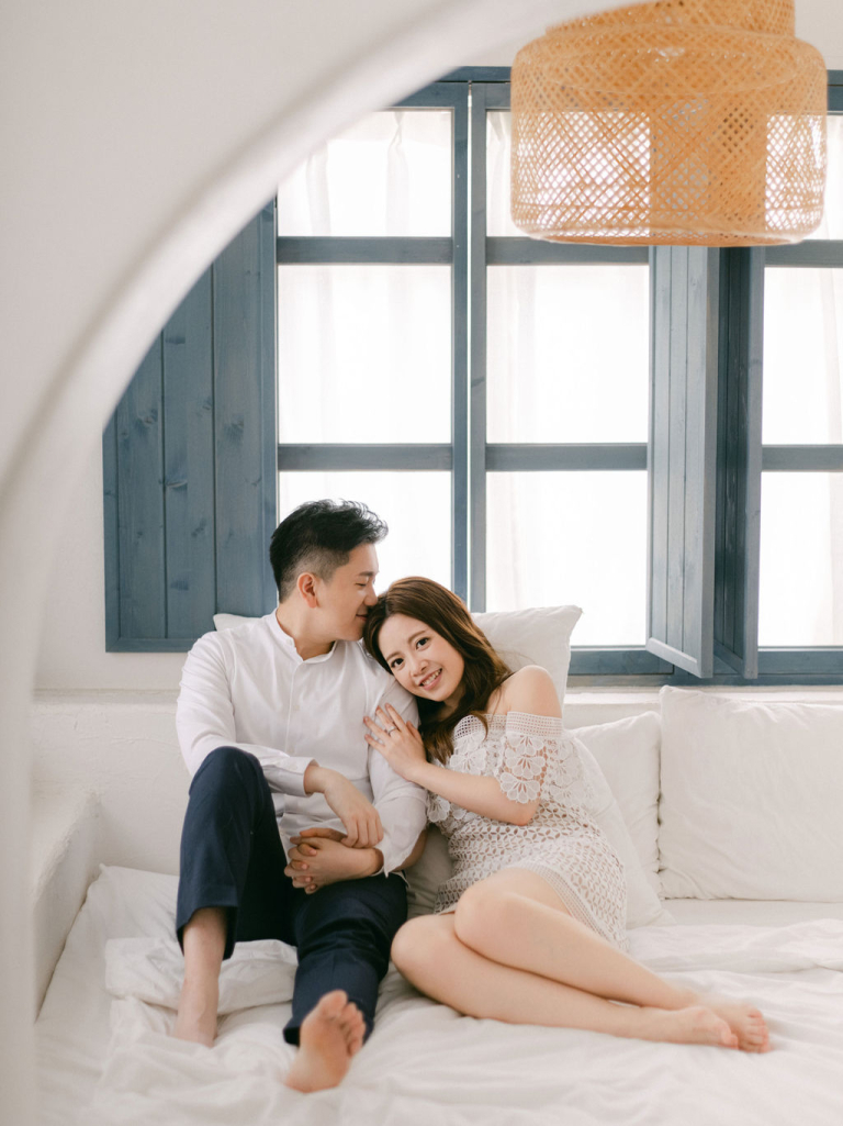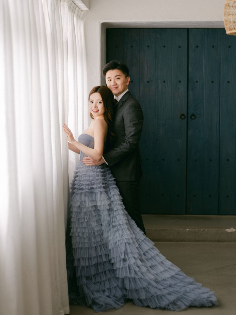 Me and my team with Christina and Ryan Cheung's pre-wedding shoot, a day that promised romance and beauty. We started in a cozy, softly lit room where Christina wore a deep blue, lightweight gown. The couple lounged on the bed, wrapped in each other’s arms, radiating warmth and affection. The simplicity of the setting highlighted their genuine connection, making every shot incredibly heartwarming.
