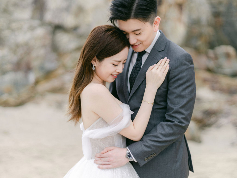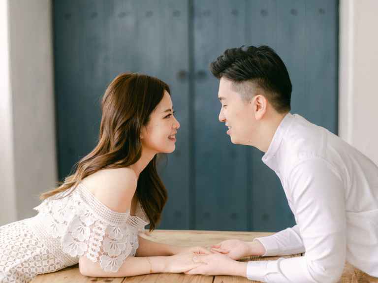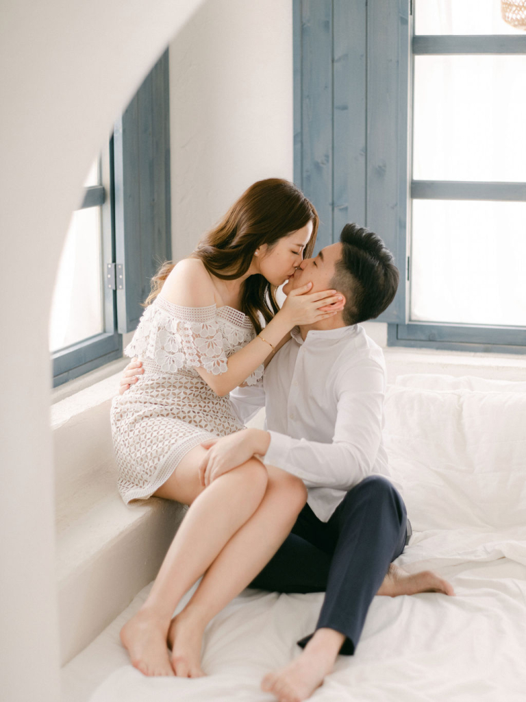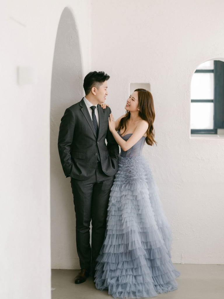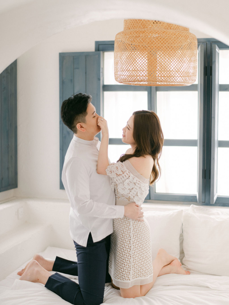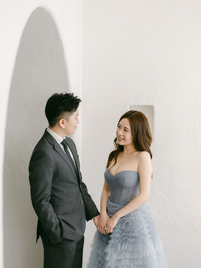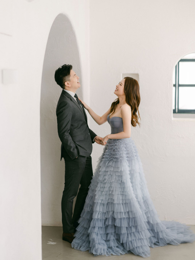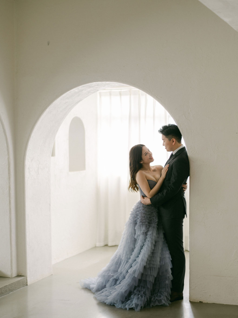 Me and my team with Christina and Ryan Cheung's pre-wedding shoot, a day that promised romance and beauty. We started in a cozy, softly lit room where Christina wore a deep blue, lightweight gown. The couple lounged on the bed, wrapped in each other’s arms, radiating warmth and affection. The simplicity of the setting highlighted their genuine connection, making every shot incredibly heartwarming.