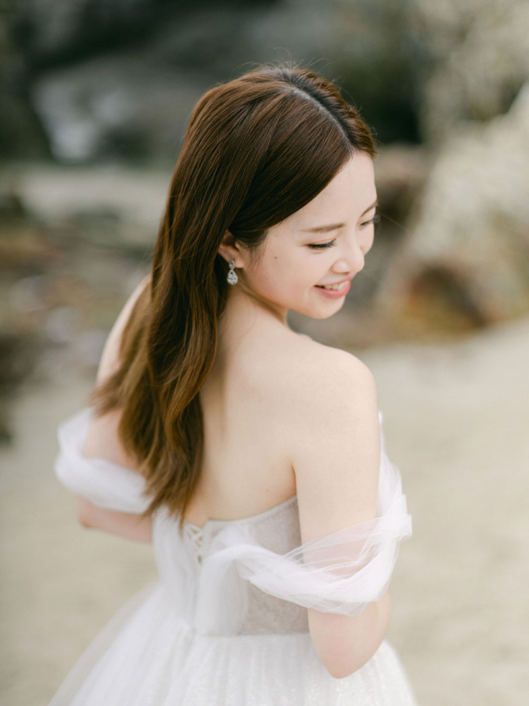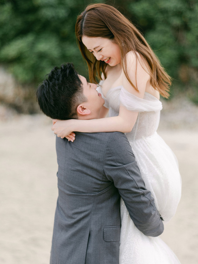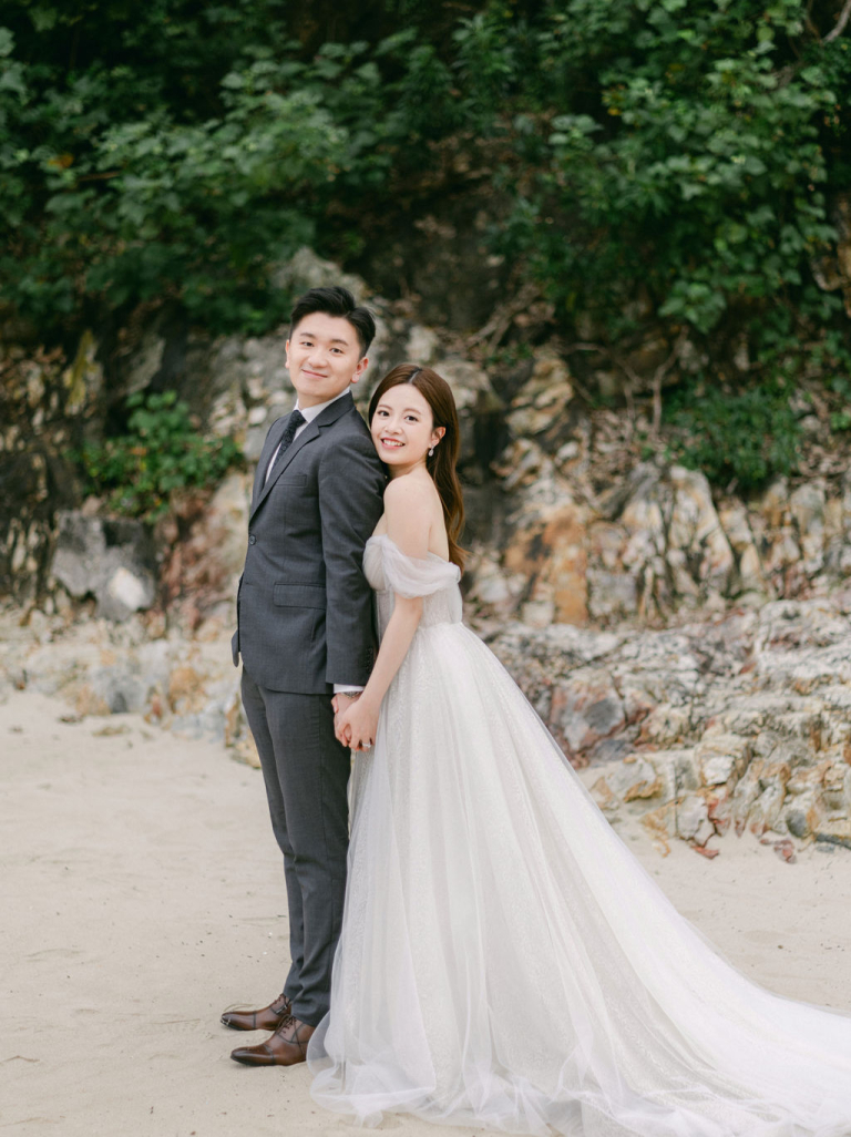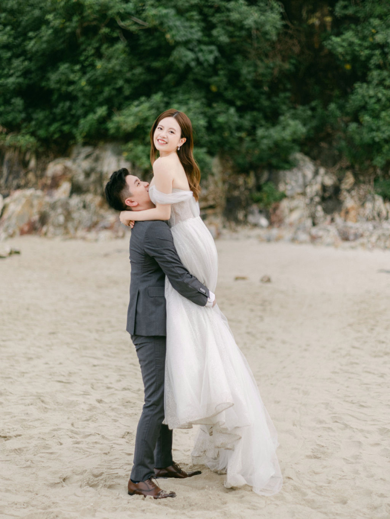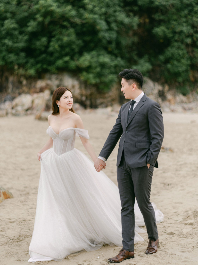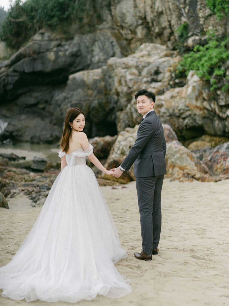 As the day progressed, Christina changed into a stunning white wedding gown, and Ryan donned a sharp suit. We headed to the beach, where the natural light and expansive horizon provided a breathtaking backdrop. The golden sand and gentle waves complemented Christina’s elegant dress, and Ryan looked dashing beside her. They walked hand in hand along the shore, sharing smiles and soft kisses, embodying the perfect picture of romance.