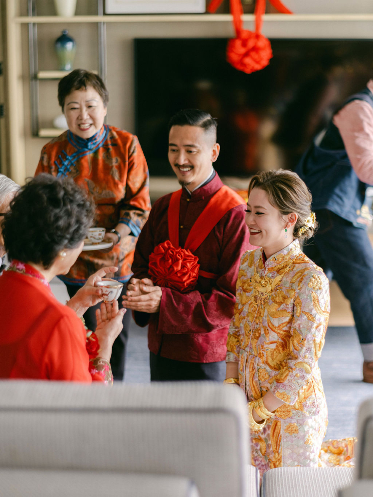 The Four Seasons Hotel provided a stunning backdrop for Pearl and Alan's wedding ceremony and reception. The grandeur of the venue added a sense of luxury to their special day. The morning tea ceremony was a beautiful cultural tradition, with Pearl and the female family members donning elegant qipaos. The vibrant colors and intricate details of their attire created a visually captivating scene.